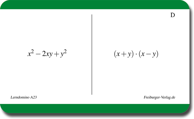 Der Klassensatz enthält 12 verschieden farbige Dominosätze des Lerndominos A23 "Binomische Formeln", also insgesamt 240 Karten, für 12 Kleingruppen mit jeweils zwei bis drei Schülerinnen und Schüler.